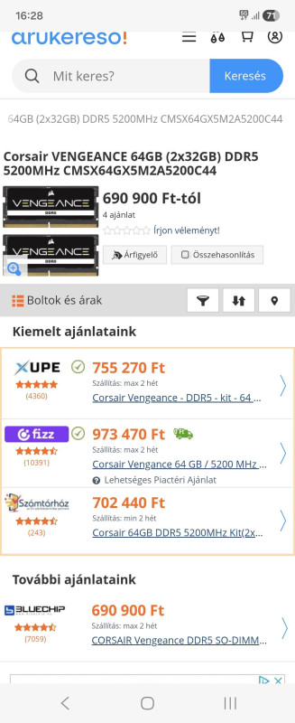Szóval ha valaki gépet szeretne venni az még ez évben tegye meg, mert nagyon kicsi rá az esély, hogy jövőre olcsóbb lesz ugyanaz. Kiszórják a készletről ramokat most, utána dupla és tripla áron adják majd őket. Árukeresőn nézegettem a desktop ramokat nem tudom pontos tipust már hirtelen 32gb-os valami speckó rgb-s kivitel jó márka egyik helyen még 100ezer körül volt rákattintok készleten már nincs. Többi bolt rendelésre tudnak hozni 1-2 hét és 200ezertől indultak az árak. Itt aprón már jegelve volt 120-130e-ért 1-2 napja rakták fel.
