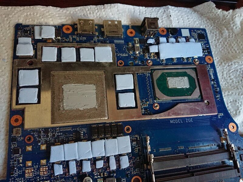 Segítségre lenne szükségem. Adott egy Helios 700-as (amit Mikulásbától vettem 2021-ben) egy i7-9750H + RTX 2070 kombóval, 32 GB DDR4 2666 MHz-es memóriával. Mivel nagyon rég volt újra pasztázva, gondoltam újra kenem. Vettem ugyanolyan MX4-eset a CPU + GPU-hoz, amit anno a Helios 500-ashoz, illetve TP-3 1,5 mm vastag thermal padot a többi alkatrészhez. Jelenleg így néz ki: