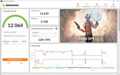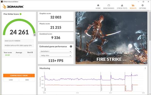 A VGA ugyan nem 150+15W, mint az AW-ben, hanem 150+5W, de attól még eléggé szépen teljesít:Érdekesség, hogy alapvetően Optimus laptop, azonban az MSI beépített MUX kapcsolót, szóval az iGPU kikapcsolható, hogy csakis az RTX 3080 menjen.