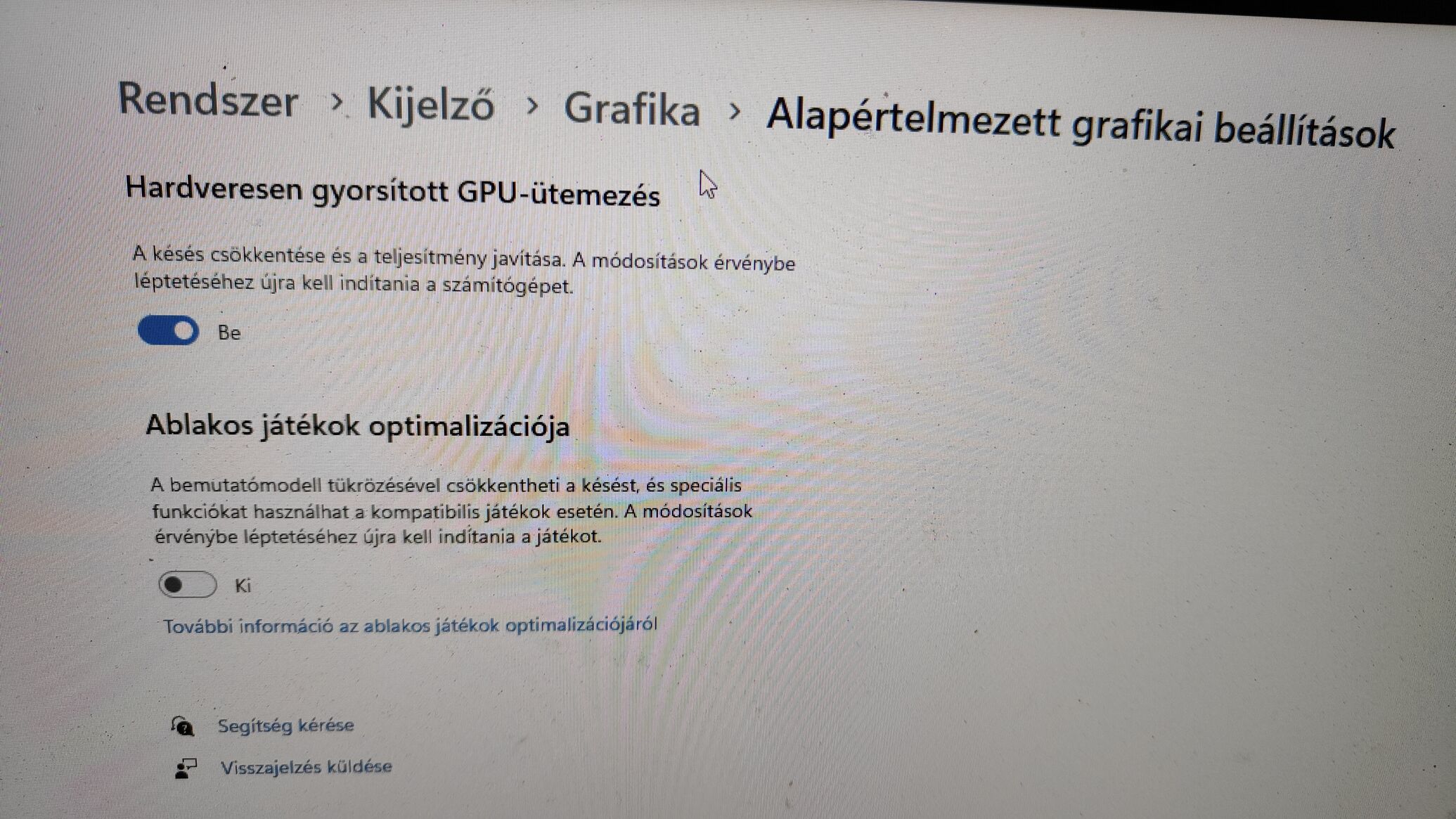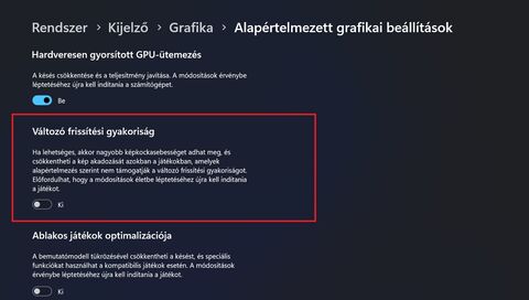 Gépház/Kijelző/Grafika/Alapértelmezett grafikai beállítások módosítása/Változó frissítési gyakoriság legyen KIKAPCSOLVA.