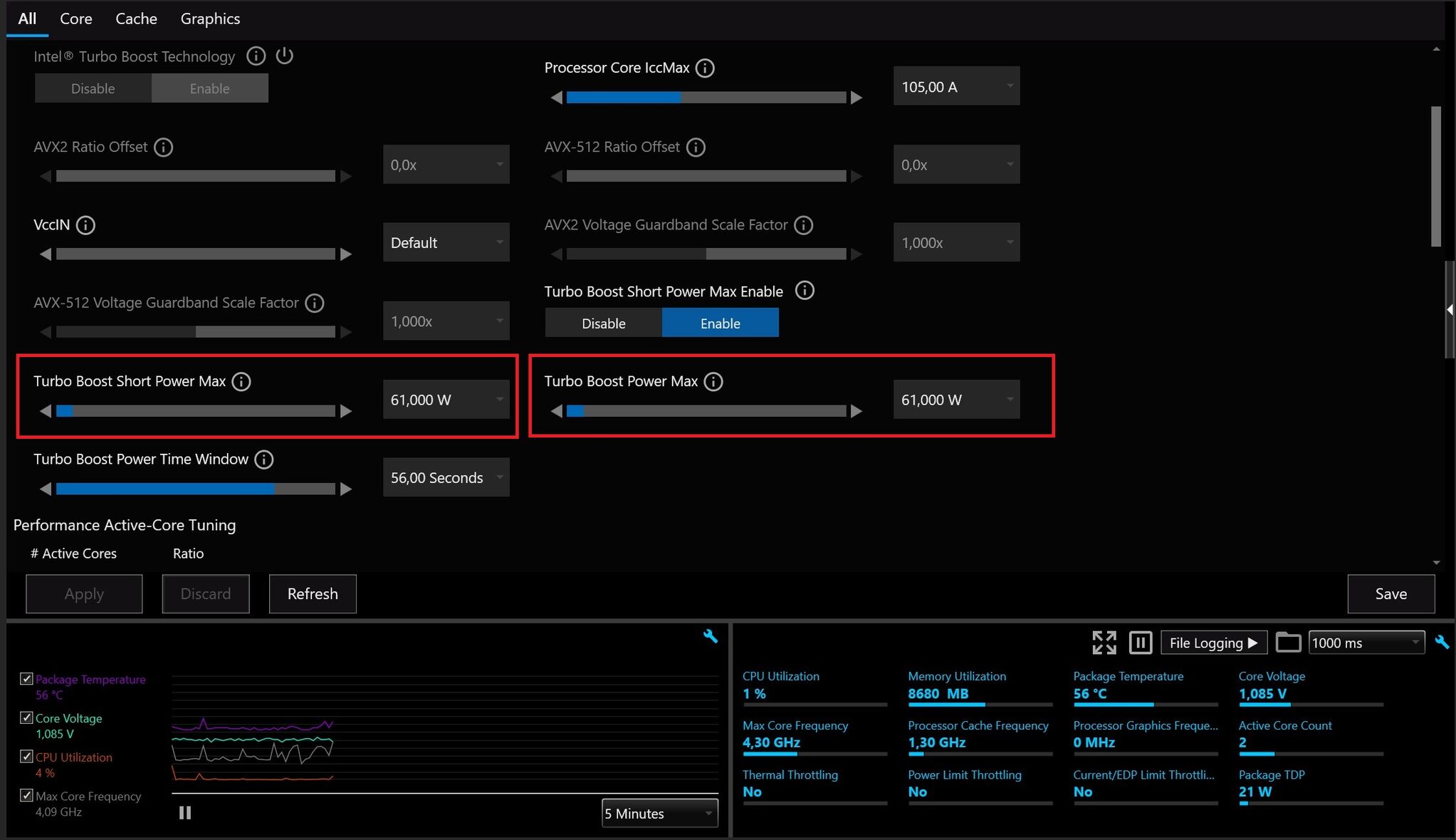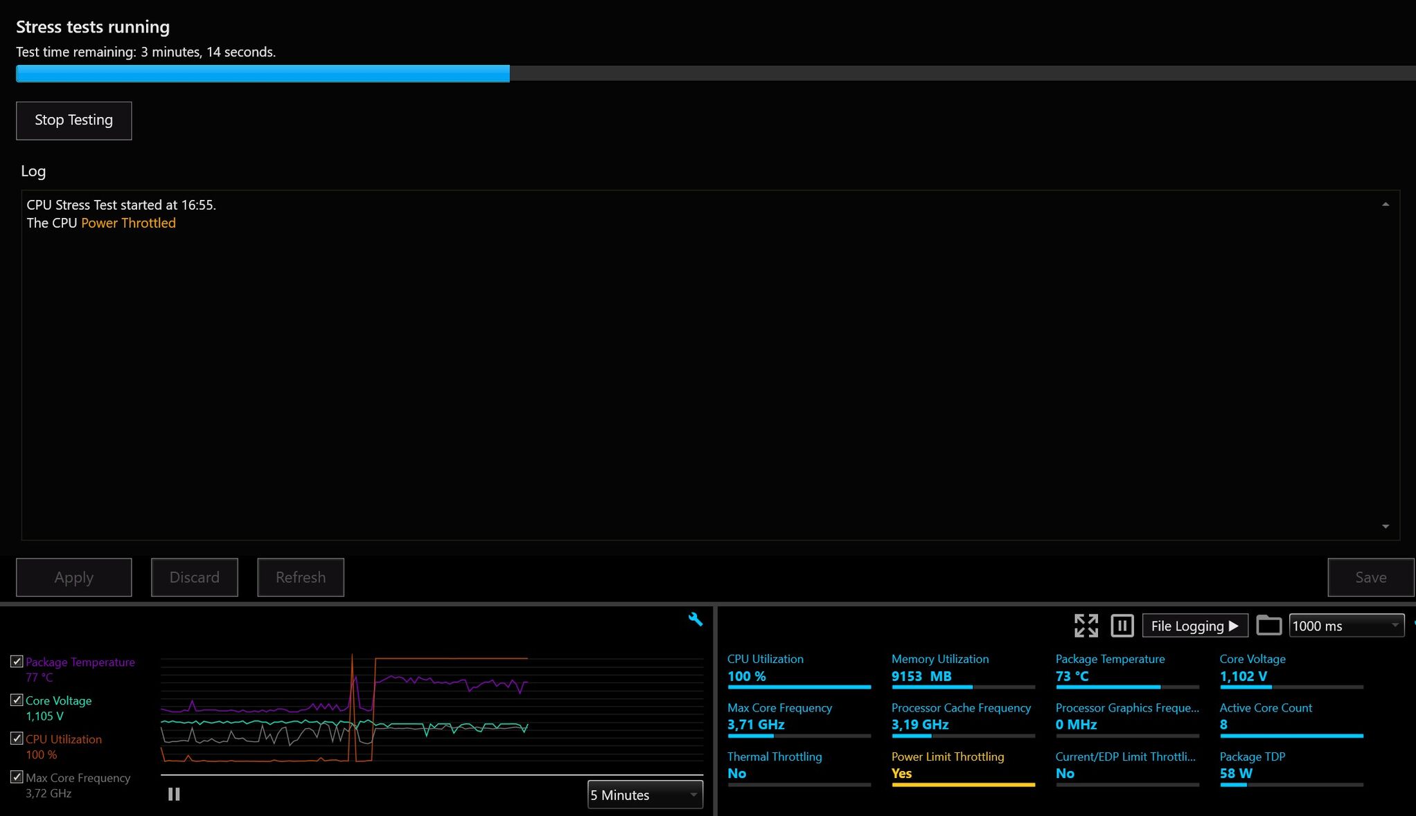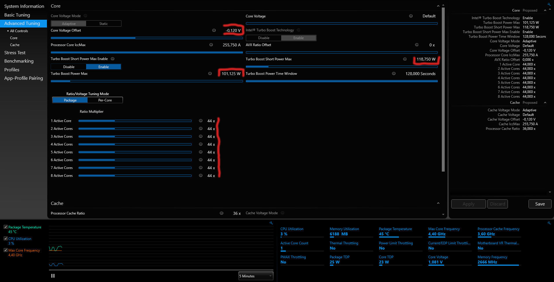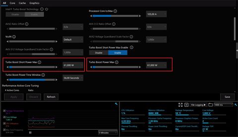 Egy azon órajelen le tud kérni több Watt-ot is ha úgy van beállítva, (én most kicsit leszorítottam)....játék alatt stabil és nem használ olyan speciális számításos feladatokat mint pl a CB R23 és társai kérnek így lehet nyugodtabban szabályozni. Mert ha kell neki a AVX és társai akkor úgyis leveszi független mi van beállítva, az adott órajelnek megfelelő fogyit érvényesíti. Szóval játéknál sosincs teljes strapa. Aztán teszteljed Geekbench, cpu-z-vel. Az a jó hogy online mutat mindent, alulra bepipálsz mindent és mehet a strapa és ekg vonal figyelés.