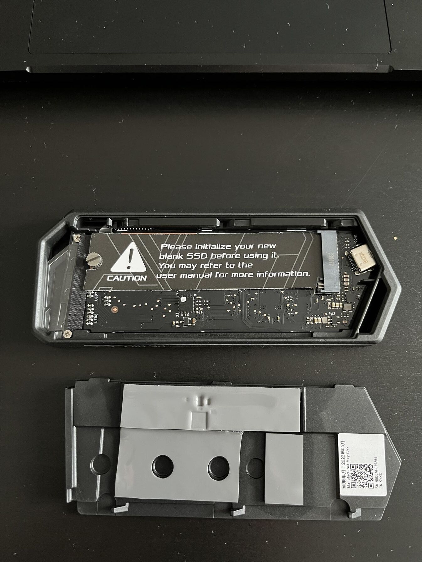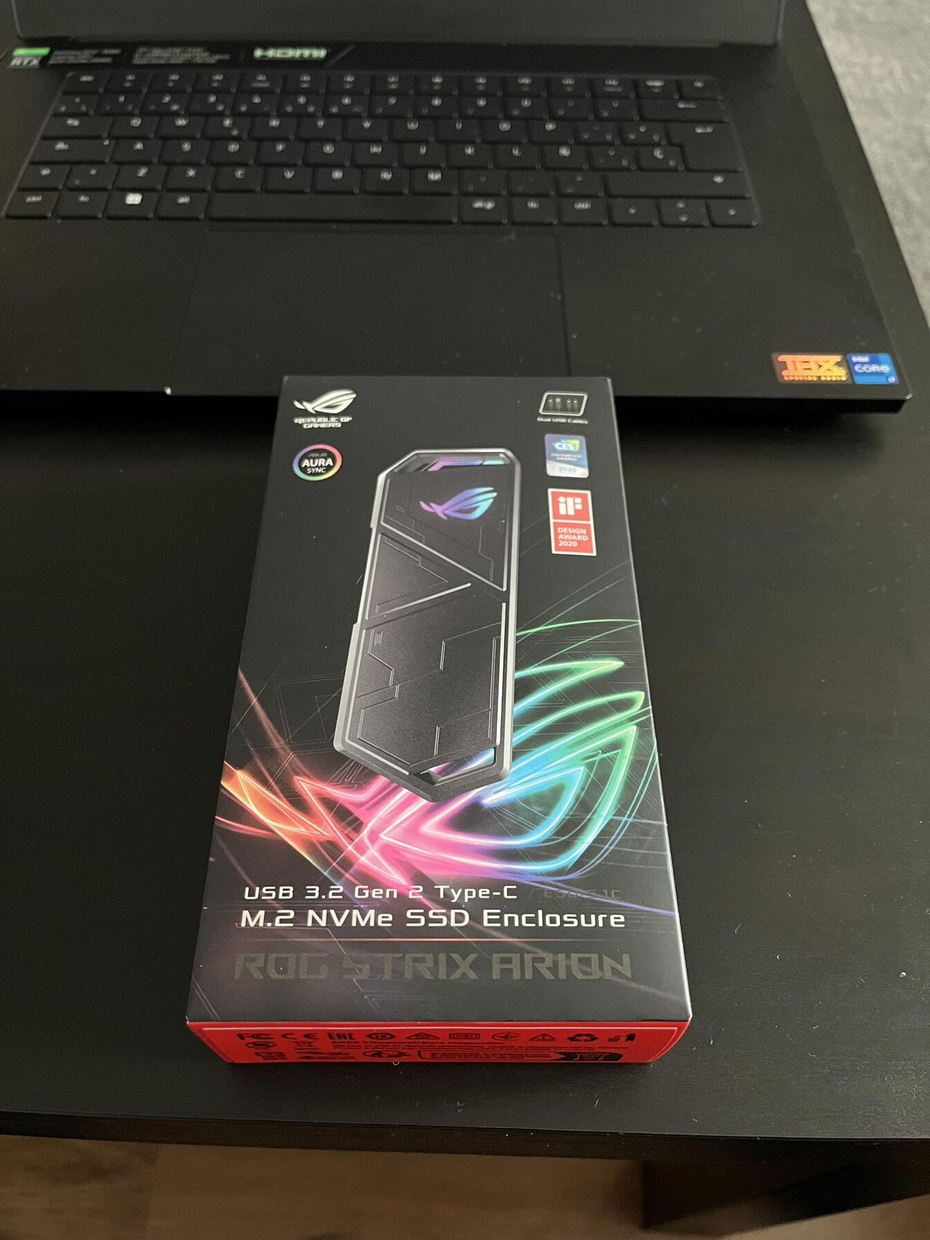 "ROG Strix Arion M.2 NVMe SSD ház — USB3.2 GEN2 Type-C (10 Gbps), egy USB-C - C és egy USB-C - A vezeték, csavarhúzó nélküli szerelés, hővezető lapkákkal, illeszkedés PCIe 2280/2260/2242/2230 M key/B+M Key foglalatba