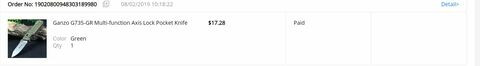 Január 10-én rendeltem és kifizettem egy bicskát, szállítással együtt 23 dollárt.