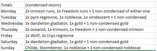 Szimplán csak szeretnék új team compot összerakni abyss-hoz, új karakterekkel játszani, de ez a rendszer amit kitaláltak hogy bizonyos nyersanyag csak bizonyos napokon elérhető átláthatatlanná teszi a fejlesztésüket. Ha nem lenne specifikus napokra limitálva akkor nem kéne ilyet összeállítanom, mert akkor azt farmolhatnék ami épp eszembe jut / amihez kedvem van. Egyszerűen nem tudom fejben tartani hogy melyik napon mire van szükségem. -