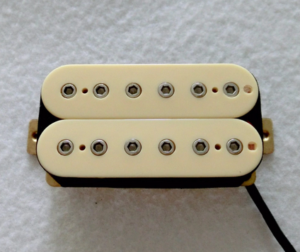 Ez is kész lett. Hihetetlen, milyen hangok jönnek ki belőle ezekkel a pickupokkal. PAF speckójú tekercsek (8,5K/7,6K), alnico 2 mágnes, nikkel-ezüst alaplap, és átmennek két háromállasú DPDT on-on-on kapcsolón, ezzel felezve, párhuzamosítva vagy sorosítva a tekercseket. Két 500K-s Alpha poti orange drop kondival. Ennél a gitárnál még a tone potinak is van értelme.