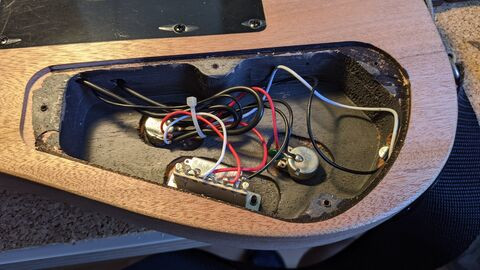 Meg persze megvan itthon a multiméter, szabályozható forrasztópáka stb. Ezt a bekötést már megcsináltam egy két humbuckeres basszusgitárban, most épp egy gitárban csinálom ezt. Erősen work in progress, de a kapcsolók már legalább a helyükön vannak.