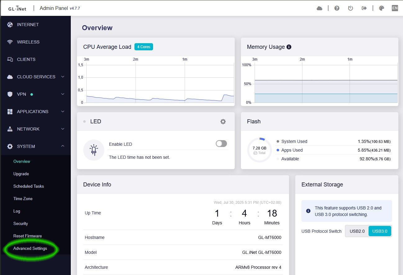 Konkrétan úgy működik, hogy van egy advanced settings menü, és azt megnyitva éred el a LuCI-t.