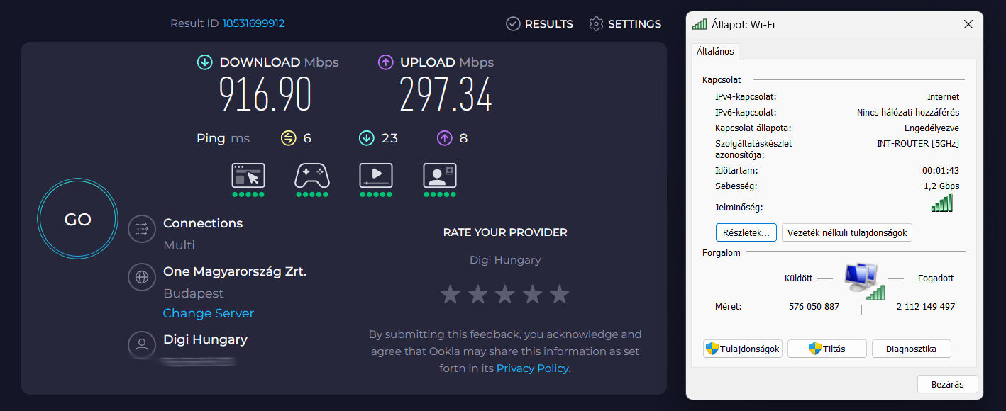 Mértem egyet párom Xiaomi Pad 6 (ac szabványos) táblagépével, 2.4GHz-en 264/235 lett az eredmény. Ugyanez a tablet 5GHz-en 900/295-öt mért, a net pedig 1000/300-as DIGI.