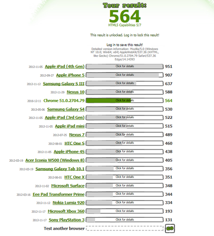 "Edge 14, compared to Chrome 52 and Firefox 48, performs well on HTML5 standards: Scored 460, it has kept pace with Firefox (scored 461) and only lags slightly behind Chrome (scored 492).[23"