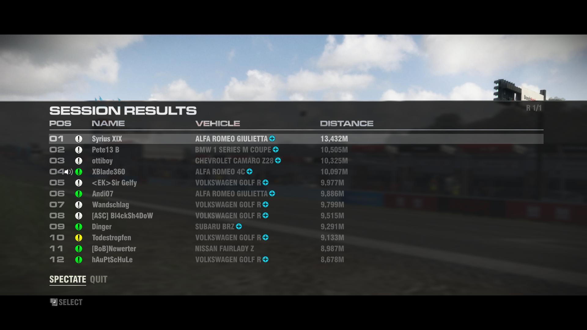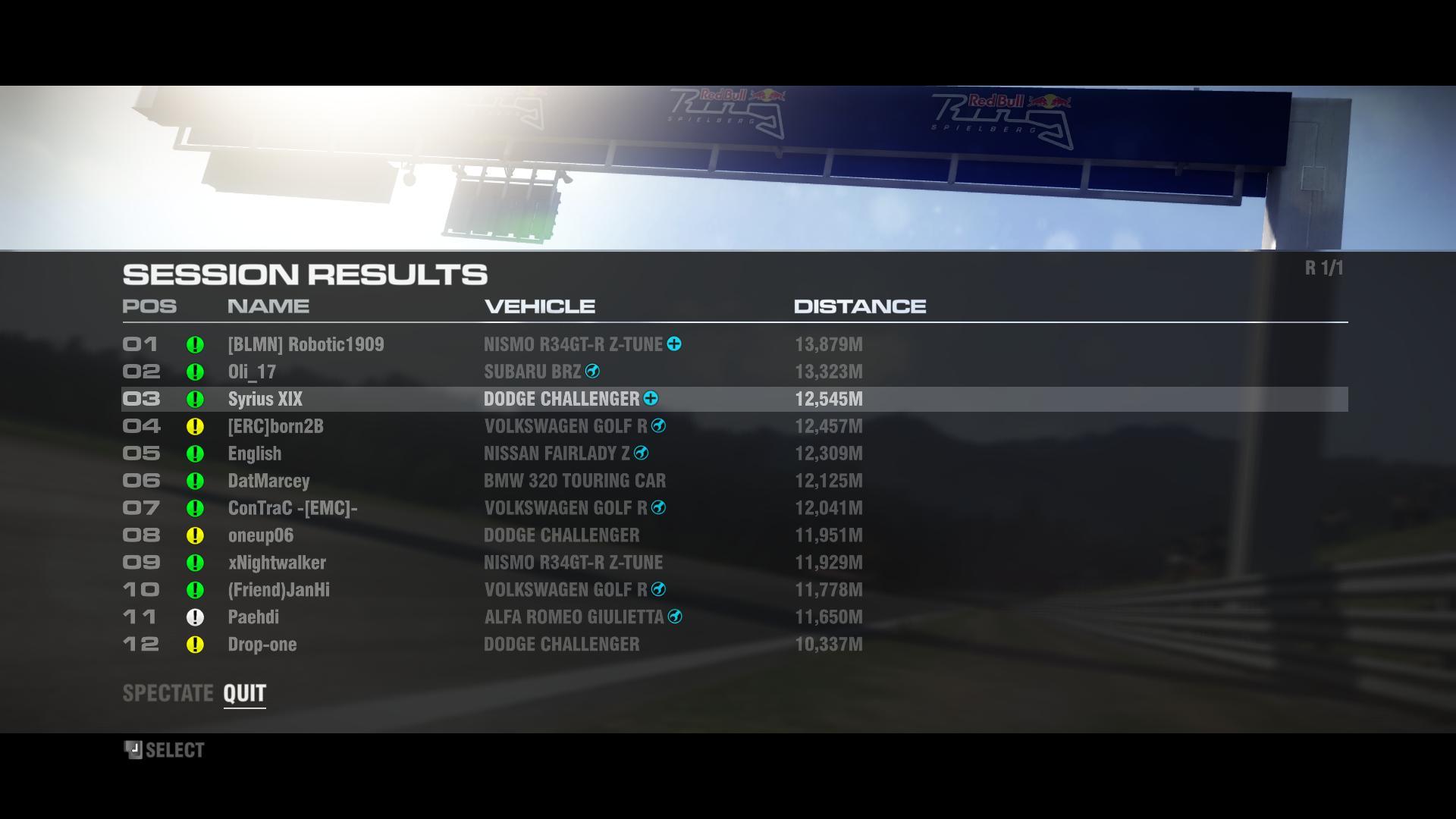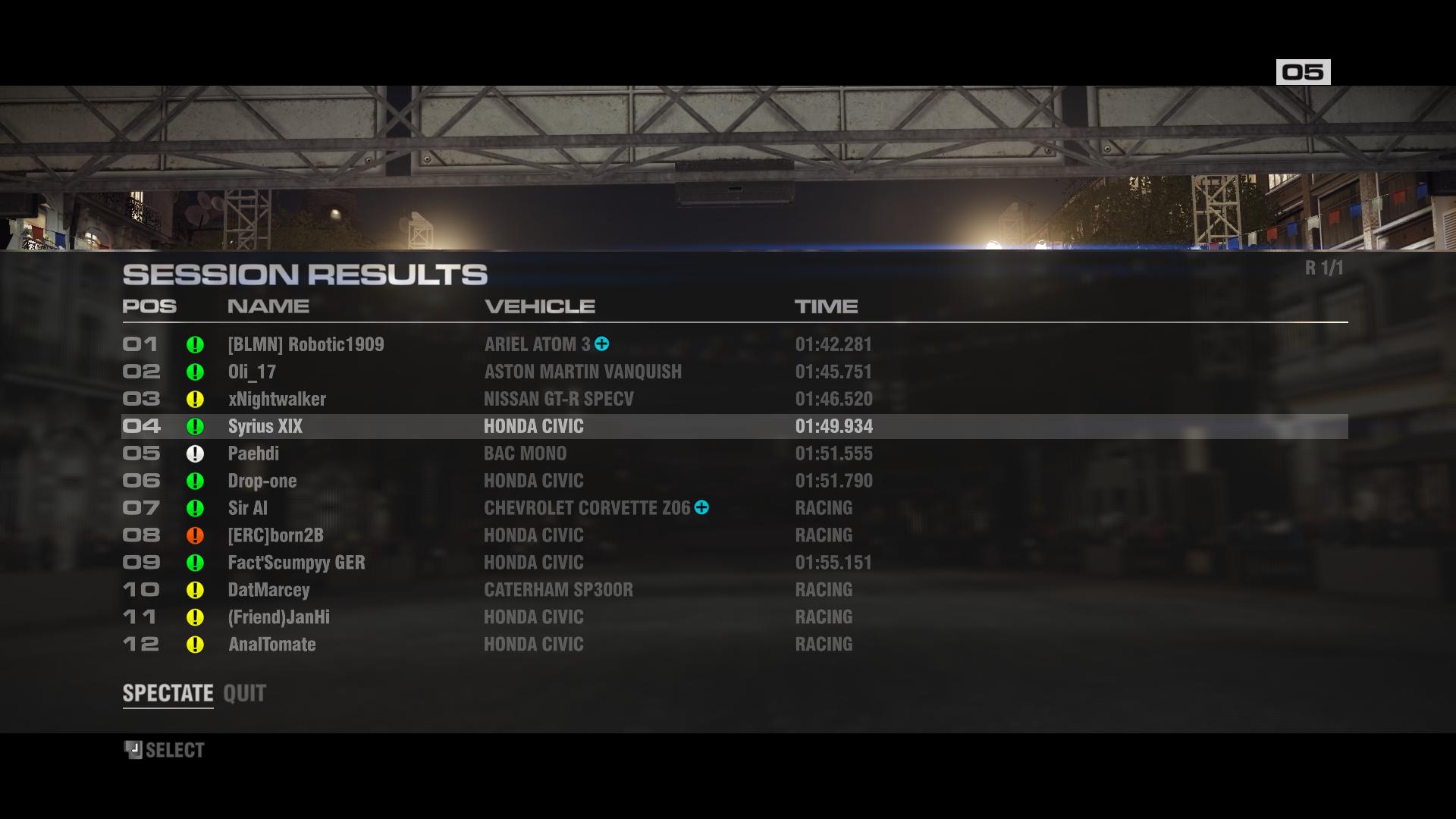 Most multiztam életemben először. Level 1-esként mentem a Level 30-asok és 25-ösök ellen. Egyetlen gyenge arc volt ő 7-es. Mivel nem mentem egyszer sem singleben a Honda NSX-el így jól oda is kúrtak, 6. voltam végig, az utolsó kanyarban fennakadtam valami kiálló lófaszon amit nem is láttam... Így lettem 8. DNF.