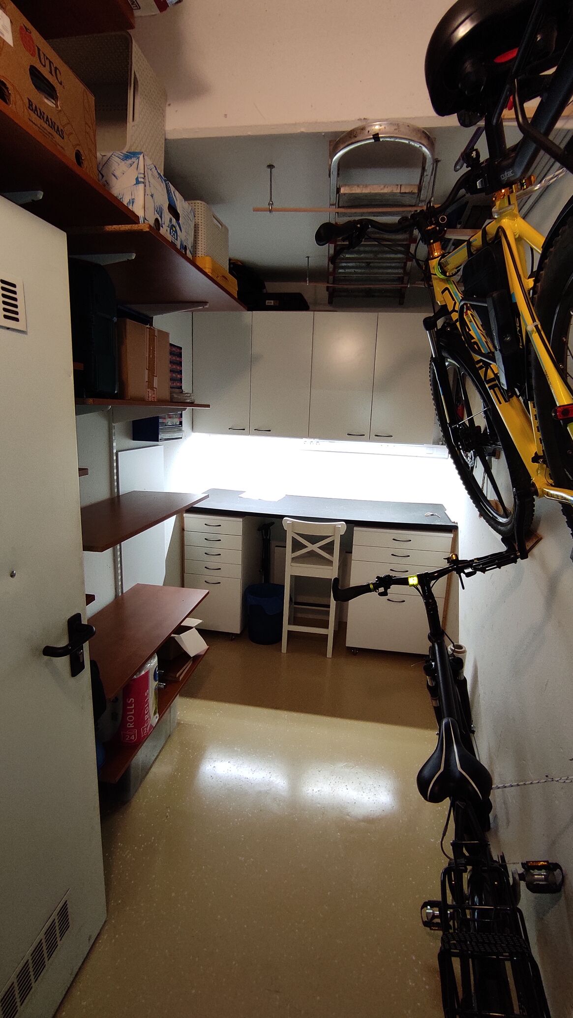 A bal oldalt van még egy OBI-s szortiment a falra csavarozva, jobb oldalt a bringák felett 4 db L-alakú konzolon a hosszabb dolgok, még a síléc is ide kerül. A fehér szekrény mellett jobb oldalt egy kb 120×60 cm rétegelt lemez tábla, benne millió csavaron, kampón lógnak villáskulcsok, fogók, reszelők, csavarhúzók, egyebek.