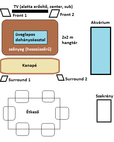 Nagyon közel lesznek a hangsugárzók, nem nagyon tud kialakulni rendes hangtér, és a falak közelsége és a sok közeli üvegfelület (nagy tévé, üvegasztal, akvárium) sem tesz jót neki.Nem lehet legalább a mozi-részleget az akvárium felé tolni kicsit, a surroundokat pedig valahová hátrébb felszerelni?
