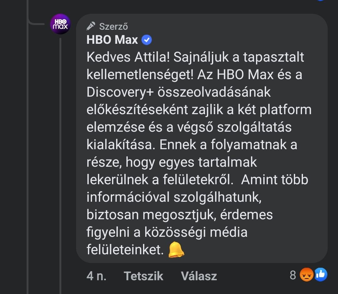 És ugye az HBO esetén nem lesz változás, mert annak az HBO, mint néven kívül nem sok köze volt az HBO Max-hoz. Ezt sokan kritizálták, hogy miért ezt lett anno a neve, mikor az HBO része kimerült abban, hogy felkerültek az HBO-s sorozatok is rá, de valójában ez egy Netflix szerű önálló szolgáltatás (különálló, saját tartalomgyártási csapattal, struktúrával).