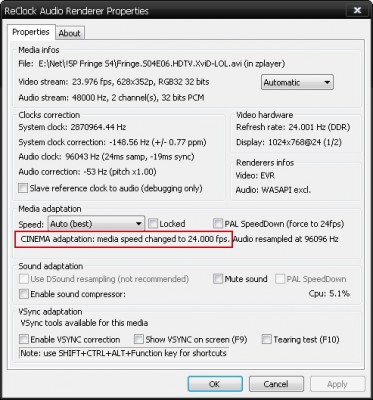 A monitorom csak 60Hz-et birja es a ReClock 24re allitja az fpst, igaz ez sem egesz szamu tobbszorose a refresh ratenek, de szerintem a lejatszas igy is tokeletes, nem tapasztalok semmi problemat (nincs akadas, nincs csuszas), a madVR is azt irja egy 2 oras film utan hogy 0 delayed frame, 0 dropped frame, 0 presentation glitch. -