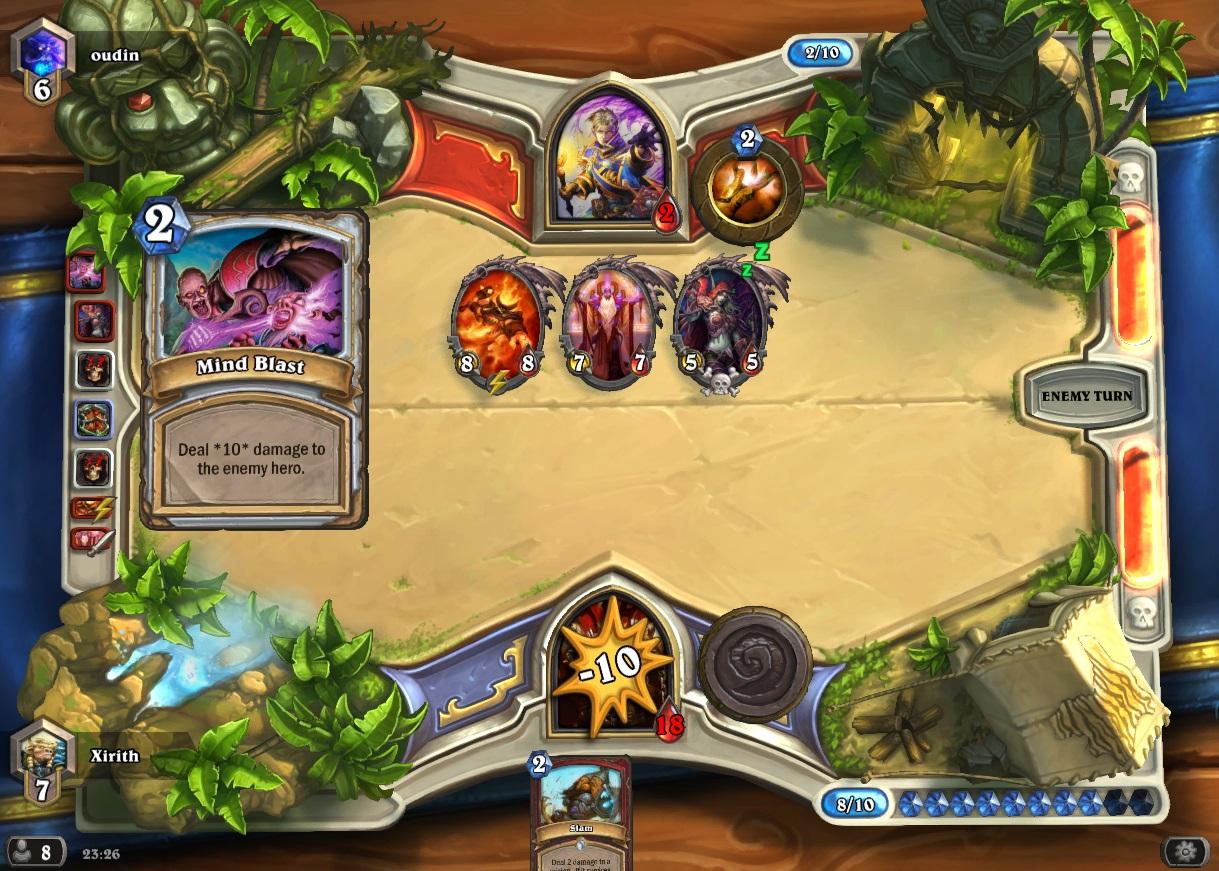= sosem játszottam vele, igazán azt sem tudom mik illenek bele. Ezzel már összejött HC Heigan: Alexstrasza kill lett végül.Loatheb HC viszont az a boss, ami kifogott rajtam és jópár próba után most úgy döntöttem hogy utánaolvasok, mert sajnos saját kútfőből ez már nem megy. Apróbb változtatásokkal próbáltam az előző Moltenes freeze mage deckket, de mikor tökéletesen kijött az eleje (vagy legalábbis elég jól), és így álltam ellene, akkor jött 1 poison seeds. Aztán még alakítgattam 1-2 dolgot, nekimentem párszor, de nem jövök rá hogyan is kéne túlélnem. Ha fagyasztásokat kapok kézbe akkor megöl hero powerrel, ha leszedem a lényeit szintén megöl hero powerrel.
