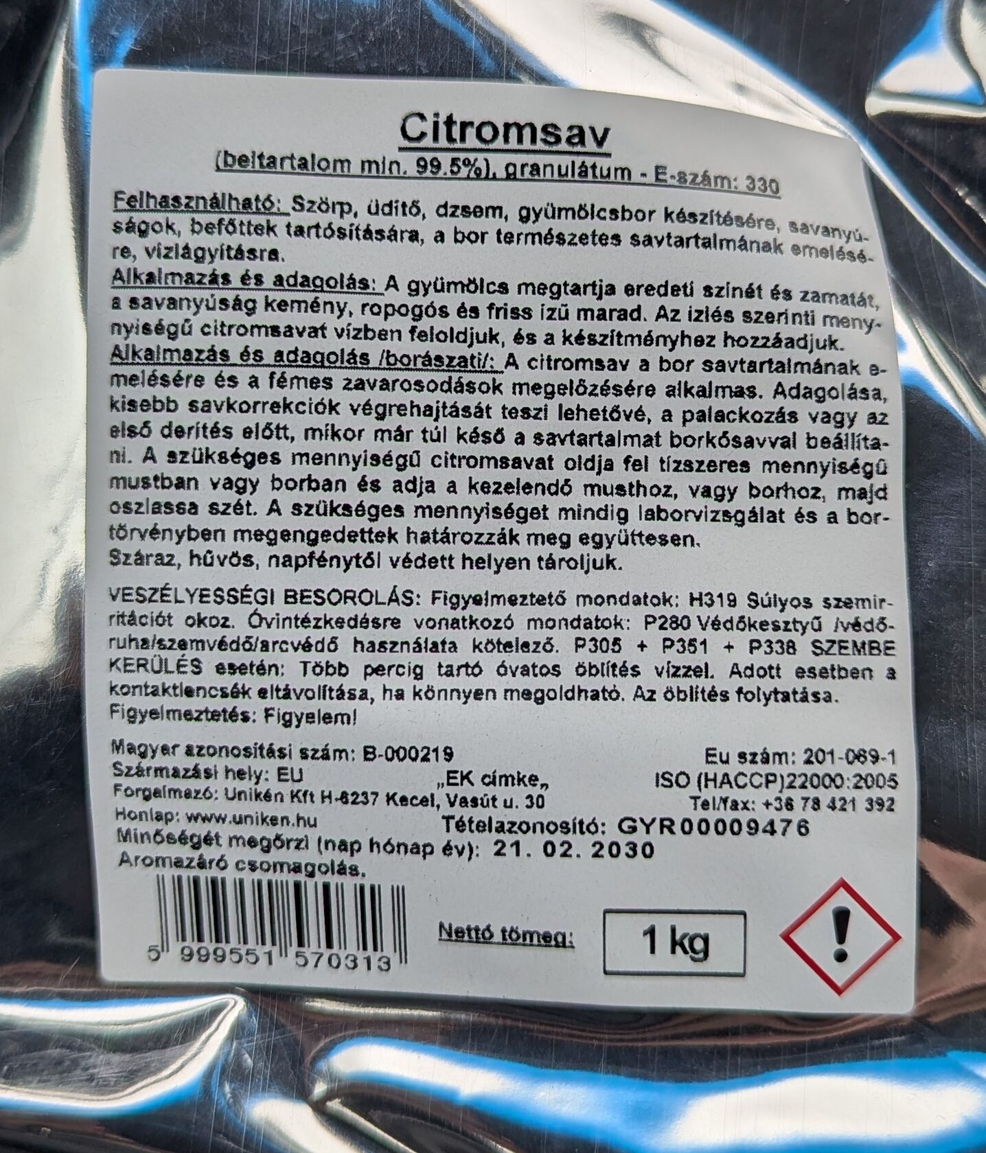 Na a vascső az a 10%-os verzió, igaz? Mert aztán jön a következő kérdés, hogy ezt hogyan, milyen arányokkal érem el. 1 liter vízhez mennyi ilyen kell? Ha 1 liter víz 1 kg, akkor annak a 10%-a 100 gramm? Szóval 1 liter vízhez ha adok 100 gramm ilyen citromsavat, akkor megkapom a 10%-os oldatot.