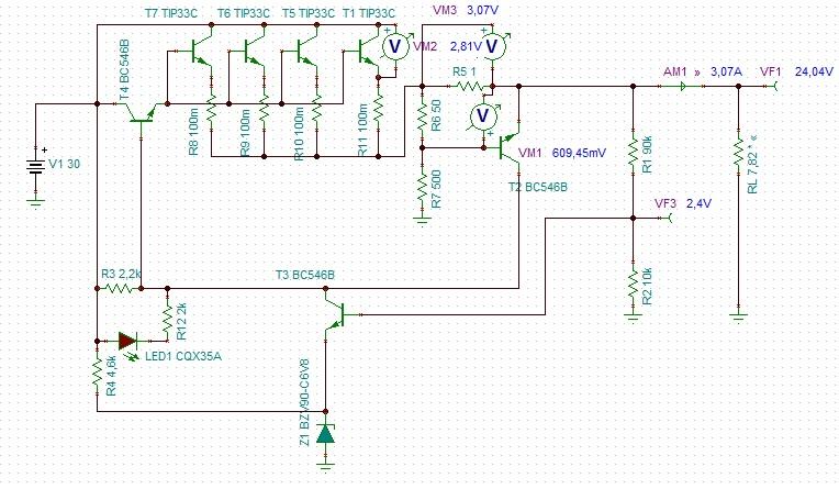 Nagyobb áramnál lehet túl kicsi lesz a BC546B. Márcsak azért is, mert a Tina érthetetlen módon 100-as hFE-vel szimulálja a TIP33-at, ami pedig 20...100. Tehát nagyobb bázisáramot fognak igényelni.