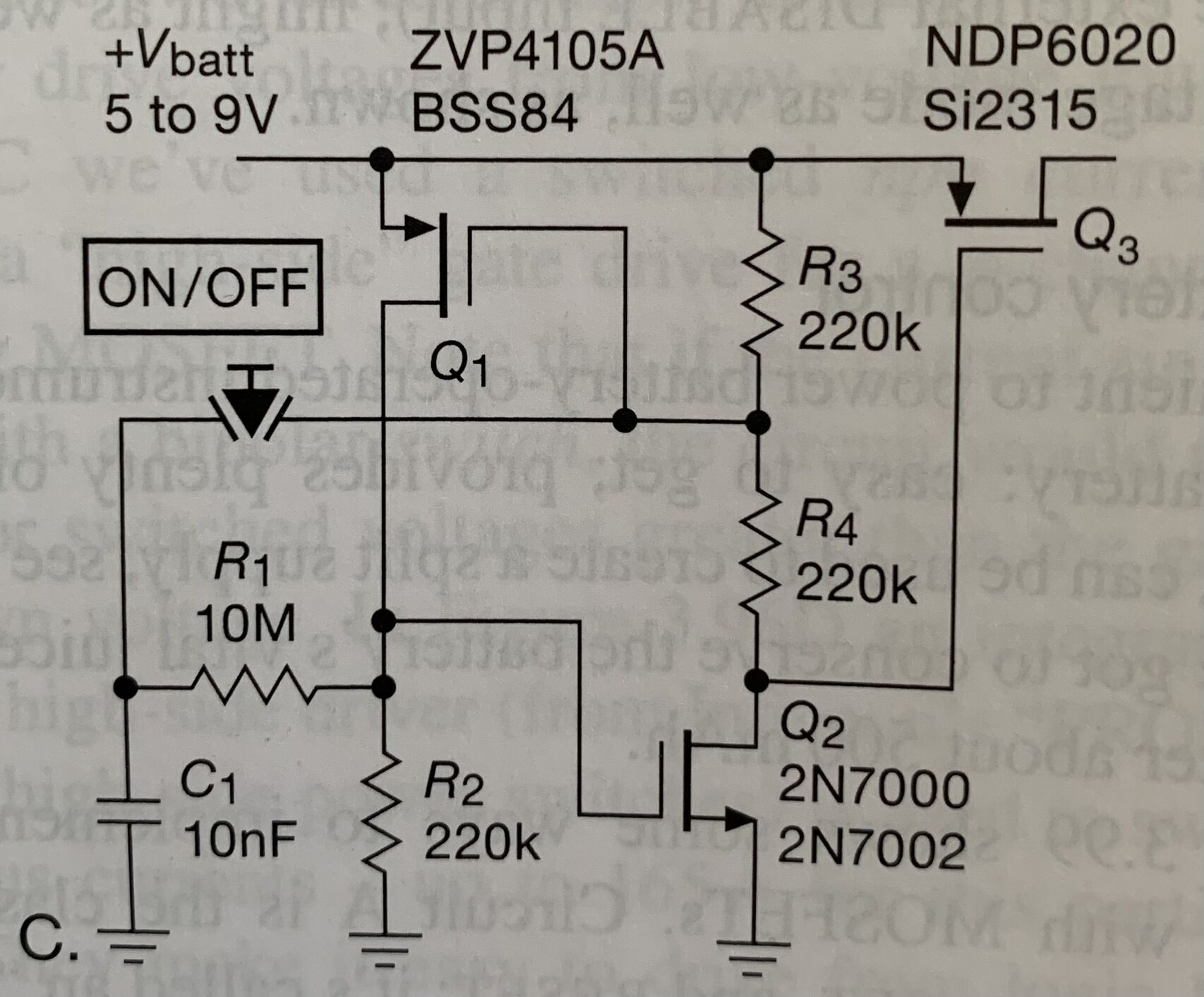 Vagy az ON állapotban a C1 fel van töltve Vbatt-ra, így amikor újra megnyomom a gombot ez felhúzza Q1 gate-et ami ettől kikapcsol és ezért? -