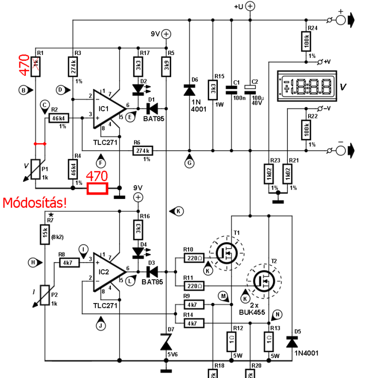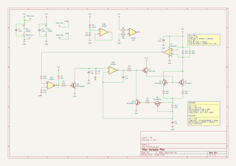 Az első oldali Q6 "áramfigyelő"-nek nincs bázisellenállása, ha megszalad a táp, akkor ennek is akkora lesz a bázisárama amitől tönkremegy. Amúgy a Q4, Q6 kiváltható lenne egyetlen NPN tranzisztorral. Az LM358-on a 10uF nagyon lelassítja az egész szabályzást, nagyjából használhatatlan szintre.Amúgy nézd meg hogyan működik az ún. "lebegő opampos" táp, ill. milyen a kapcsolási rajza. Ilyenekből érdemes kiindulni.
