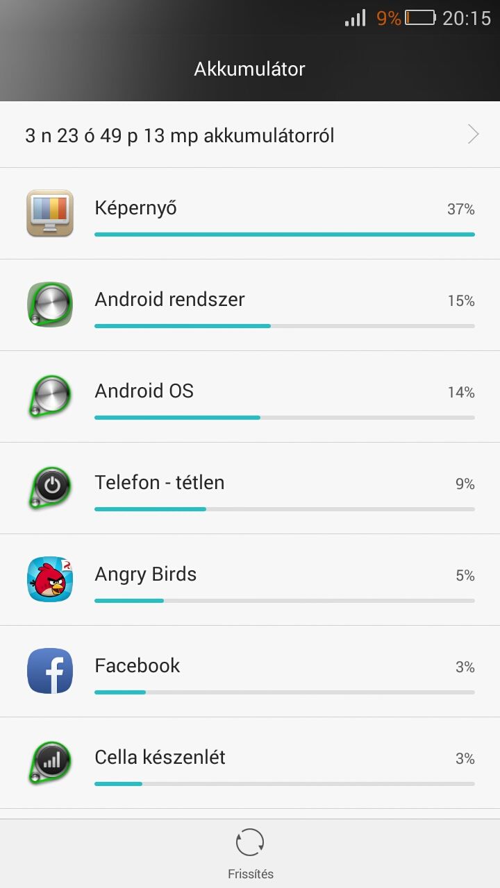 A telefon azt írja, hogy 16 óra 23 perce megy. Egy csomó dolgot próbálgattam. Bekapcsoltam az intelligens akkumulátor használatot, Volt egy kevés wi-fi-zés, kb. 50 perc gps használat, és jelenleg 63%-on van az akksi. Ebből a képernyő 20%-ot használt, ami 3 óra 16 perc.