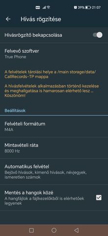 Kipróbáltam a Huawei Mate 20 Pro telefonomon. Rengeteg beállítást tartalmaz, de sajnos a gyári hívásrögzítőhöz képest rossz a felvétel minősége a mintavételi ráta felemelése után is. Köszi, azért B tervnek megtartom.