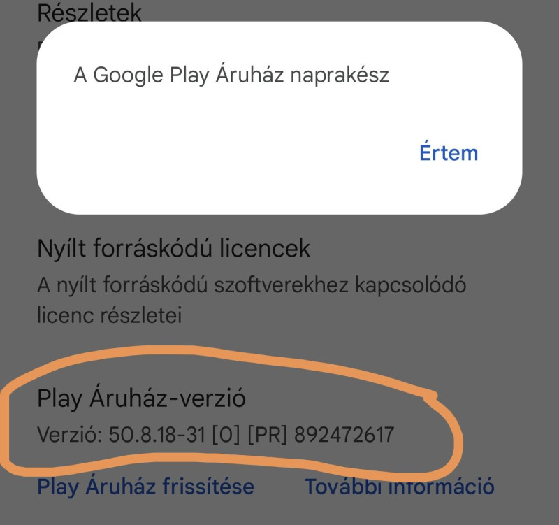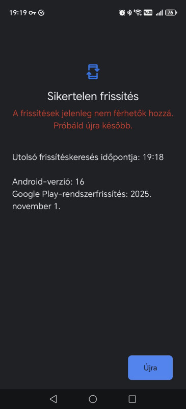 Kijött egy Google Play rendszerfrissítés, 70 mega. Viszont nem tud települni. Eljut 27%-ig, majd kér egy újraindulást. Először ez nem sikerül, majd másodjára is újraindul, a frissítés nincs fent.