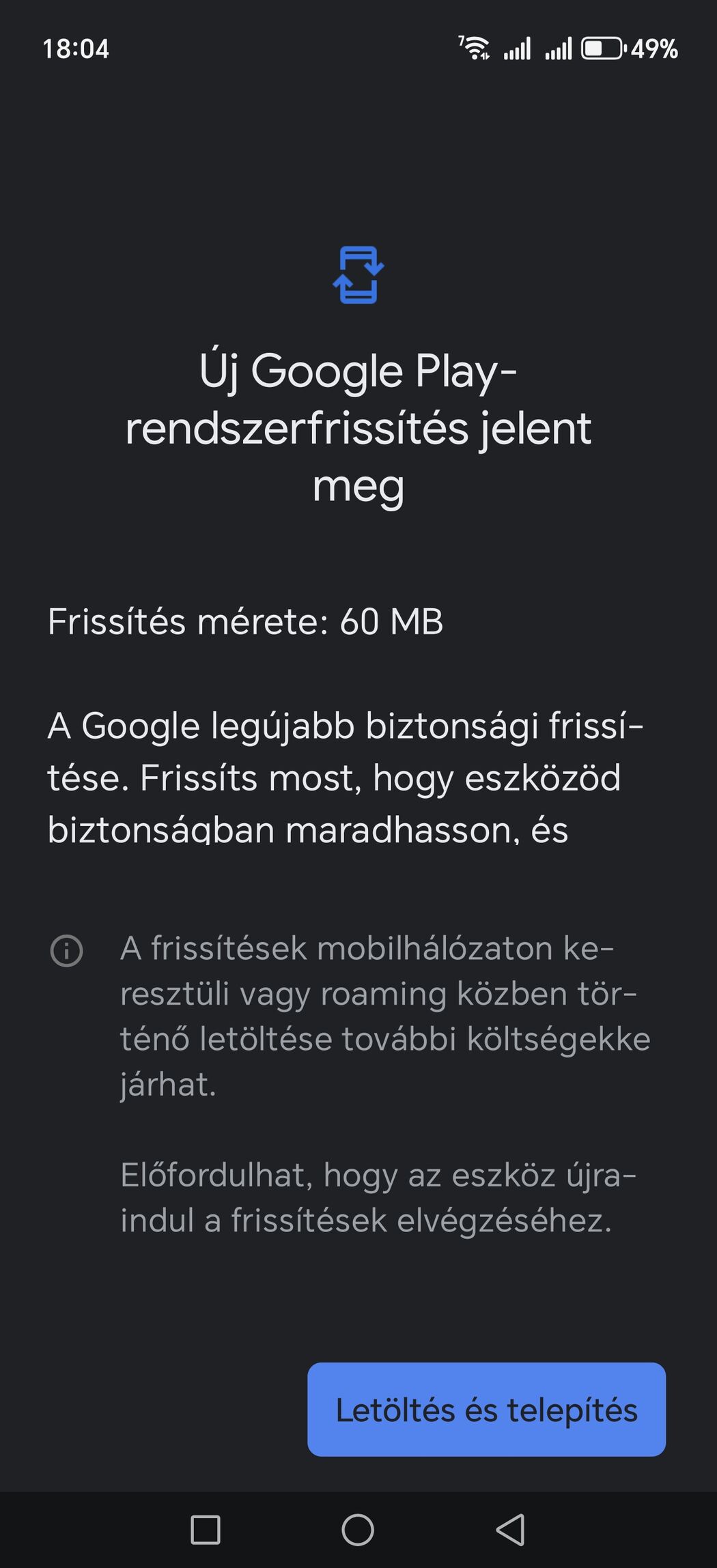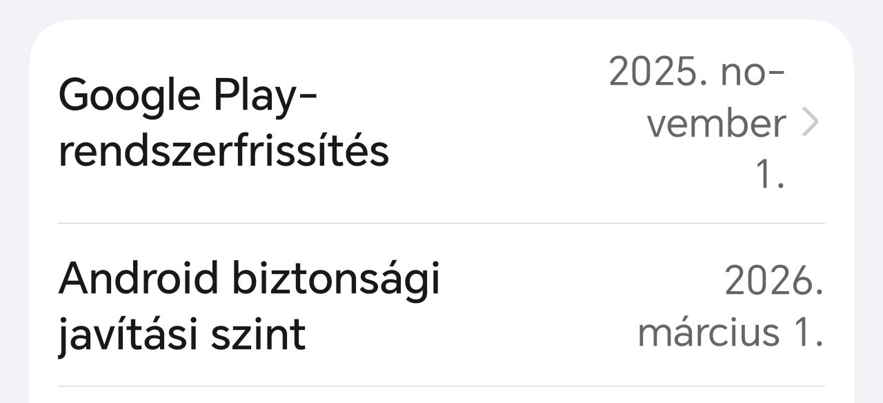 Nekem is ma megjött a frissítés, de a Play biztonsági szint 2025. november 1.-en maradt: [kép] . Talál rá 60MB-os frissítést, de amikor telepítené, akkor belefagy és újraindul a telefon, nem megy fel soha... Ezért most nem akarom újrarakni a telefont, több banki app, meg minden is van rajta, kb egy napom rámenne, remélem megoldják egyszer.