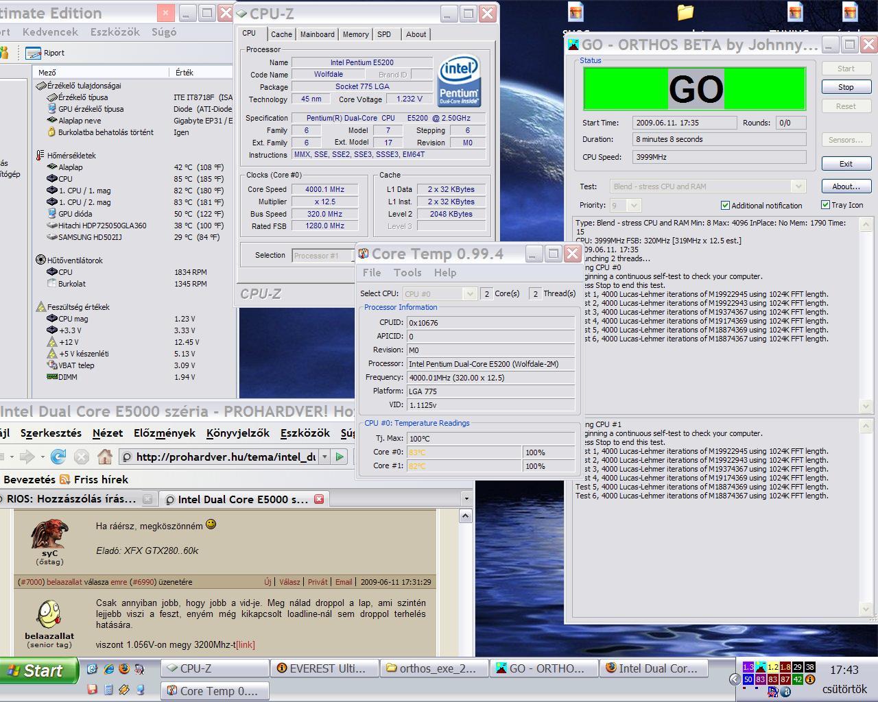 A ramoknak és a csipszettnek +0,1Volt, a proci fix 1,25Volt, C1E EIST kikapcsolva. Minden más alapon. Ramok 3,2x es szorzóval 1066-on késleltetés 5-5-5-18.