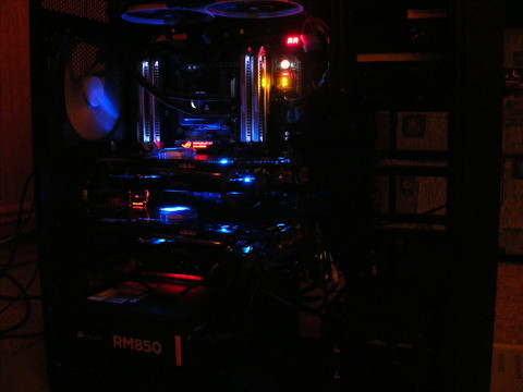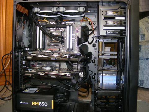Corsair Obsidian 750D a ház, 2 db 140 mm-es első venti levett előlap, hátul 1 db 140 mm-es ami húzza ki a hőt, ill. a Corsair H100 radiátorán 2 db SP120 High Performance Edition pörög ami 2350 RPM-el is képes pörögni.A deszka, ha figyeltétek régebben a fórumot egy Asus ROG Rampage IV Black Edition.