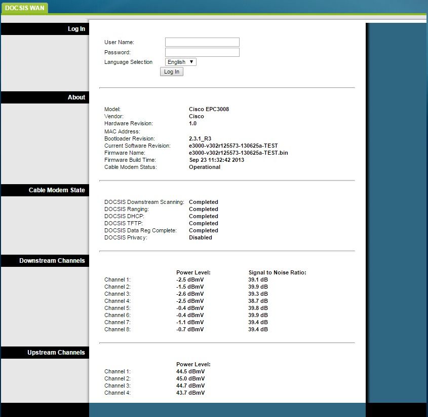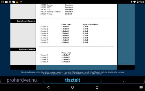 Volt szerencsém látni - mivel a szerelő megmutatta - azt a felületet, amit ő lát a laptopján amikor szerel. Teljesen magyar nyelvű volt, tehát le volt írva, hogy vételi jelszint és adási is külön, de csak egy érték és nem csatornánként részletezve. Persze nem sokáig elemezgettem, amit látok, csak egy pillanatot vethettem rá.Egyébként fehér alapon zöld színnel voltak az értékek feltüntetve.Persze nézte azt is, amit mi szoktunk a kábelmodem felületén, de ez egy speciális eszköz volt.