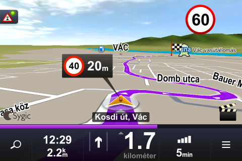 Ami nagyon tetszik benne, hogy nem csak simán kiteszi a sebességhatárt, hanem - hogy ha úgy állítod be - előre is jelzi, hogy mi lesz a következő. Emellett a forgalmi infót is ingyen adják: bal oldalon fent (természetesen ez adatkapcsolatos játék):