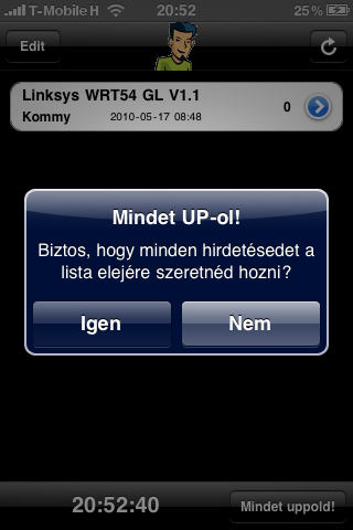 Egy kis változás a prgramban, ha a "mindnt upppold" gombra nyomunk akkor kaponk egy figyelmeztetést, ogy tényleg minden hirdetést uppolni szeretnénk e.