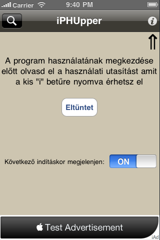 Felcserélődött az UP! és a hirdetés megnyitása. A program első indításakr egy figyelmeztető képernyőt kapunk ami felhívj a a figyelmet a segítség gombra amely elérhető a bejelentkezési oldalról és a hirdetésinktől. Lehetőség van beálítani, hogy automatikusan induljon a program. Ez kikapcsolható a telefon beállításiban lévő iPHUpper-ben. -