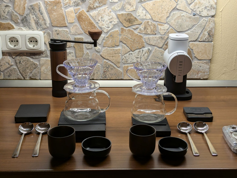 Ez alapján a szűk egy hét alapján kb egy szintre tenném a két darálót, de nagyon más világ a kettő. A Pietronak van egy egyedi karaktere, eléggé színez, mintha puha bársonnyal, melegséggel vonná be az ízeket, kis súlyt tenne az összkép alá. Egyelőre baromira tetszik, de lehetséges, hogy hosszútávon egyhangú lenne. Az M01 őszintébb, közvetlenebb. A savakat is máshogy jelenítik meg, az M01-et én árnyaltabbnak, kifinomultabbnak, illatosabbnak érzem, a Pietro savai mintha kicsit gömbölydedebbek lennének. Kávéja válogatta, hogy melyik melyikkel ízlett jobban, volt egy nordic pörkölésű (Coffea Circulor) száraz etióp, aminek jót tett a Pietro puhasága és bársonyossága, az M01-el kicsit steril volt, illetve volt egy kicsit sötétebb (The Barn filter pörk) anaerob gesha, aminél az M01 megmutatott ízhibákat (vagy a pörkölésből, vagy eleve a magokból jöhetett), míg a Pietroval semmi hibát nem éreztem. A többi kávénál (CM és DAK filter pörkök) inkább az M01-et preferáltam a tisztasága miatt, de ha nem fej-fej mellett kóstoltam volna, akkor kizárt, hogy preferenciát tudam volna felállítani közöttük, egytől egyig mind kiváló kávé volt mindkét darálóval. És 100%-ig biztos vagyok benne, hogy mindkettő darálóban van még potenciál, amit nem hoztam még ki belőlük.
