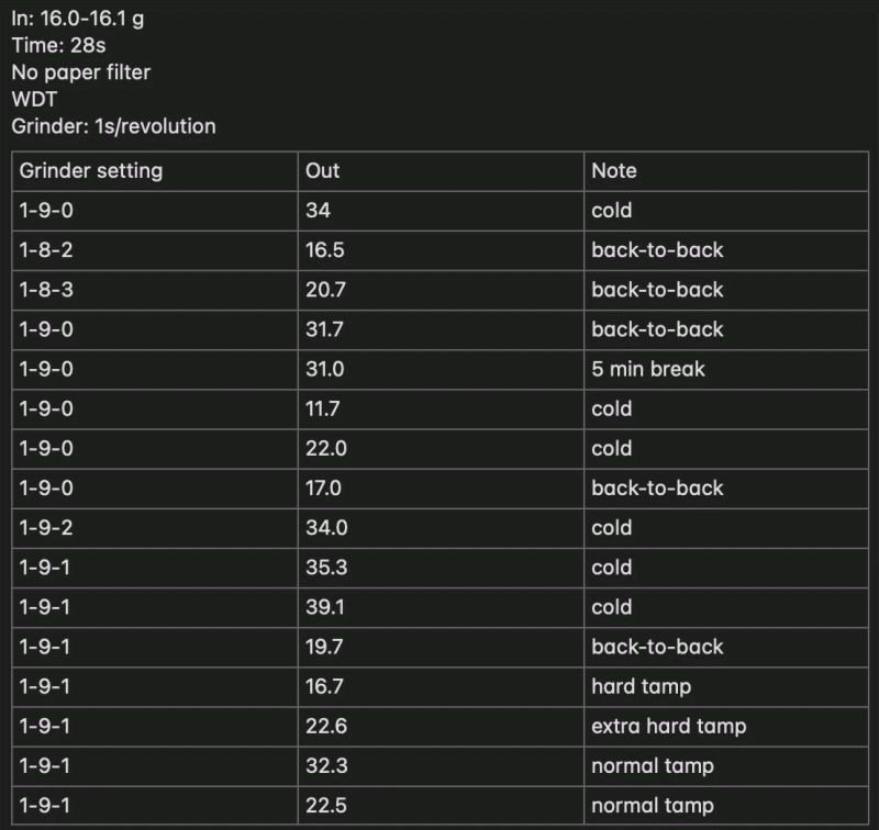 Van egy Cafelat Robotom és mellé egy 1Zpresso JX pro őrlőm. Egy 04.08-as pörkölésű Impresso Brazil Colombia kávét húzogatva az alábbi eredmények jöttek ki (kép mellékelve). A paraméterek a képen megtalálhatóak. Előáztatást nem csináltam: röviden felépítettem 6 bar környékére és utána ment tovább 8-9 bar-ig. Teljesen inkonzisztens az egész. Néha lokálisan megfigyelhető konzisztencia (pl 2. 3. 4. próbálkozásnál legalább az őrlő beállítást reflektálta a kimenet). Utána jön a teljes káosz. Amilyen állandóságot a tamperelési erőben lehet emberileg tartani, azt próbáltam végig. Az utolsó próbálkozásoknál kifejezetten ennek a hatását vizsgáltam, de semmi kecsegtető eredmény nem született.