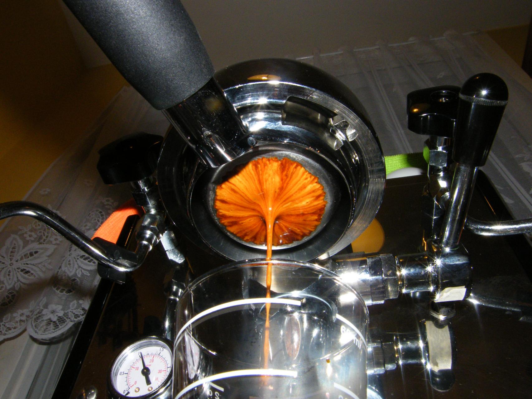 Most bontottam egy 9.16-i Has Bean Etióp Yrgacheffe Kochere Debo Natural-t. Iszonyat világosra van pörkölve, nagyon finom mézes bogyós gyümölcs illatú, őrölve még inkább elvarázsol ez az illat. Az első kört nagyon finomra őröltem, 18,5 grammból csináltam egy duplát. Nem égett meg, de alig tudtam 50 ml-t leengedni belőle, ezt a nyitott karos képen láthatjátok. Ízében szintén a méz(e)t...de hülyén hangzik mindkettő, no vissza a témához: málnát és a legvégén édes szőlőt éreztem egy pici fanyarsággal megbolondítva. Az a bajom, hogy nem vagyok túlzottan képzett ilyen téren, szóval a leírtaknál sokkal komplexebb íz tárult elém, de egyszerűen nem tudom minden mozzanatát szavakba önteni. Annyit tudok tanácsolni, hogy ezt a kávét nagyon próbáljátok ki, vagy csak kicsit. Ha jól tudom, akkor Szabiéknál is ez az új kávé, így itthon is meg lehet vásárolni. Annyira ízlett, hogy rögtön húztam egy másodikat is, kicsit durvábbra őrölve 19,2-ből, azonos, de a legmerészebb becslések szerint is csak kicsit hűvösebb vízből. Az eddig is parádés íz még finomabb lett, viszont megint nem sokat tudtam leengedni belőle, ezt meg a Molinari-s csészében láthatjátok. Ennél a változatnál a vége már pisilt, le is lőttem. Nem a lefolyásról, meg a cremaról lesz híres ez a kávé, de az íze kárpótol mindenért. Holnap még játszom vele, de be kéne lőni gyorsan fullosra, mert el fog fogyni csütörtökre, pedig Lagoon-t meg kell vendégelnem belőle