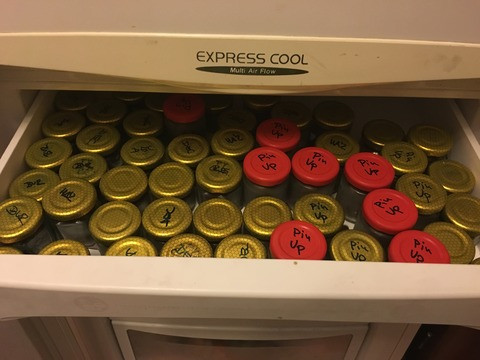 De addig is. A fagyasztós vonalról: járt már valaki úgy, hogy több fajtát fagyasztott egyszerre és mellényúlt? Mármint nem az került ténylegesen csapra mint amit hitt, hogy éppen cspol? Most, hogy velem ne forduljon (ha lehet) többet ilyen elő, nyomtattam kis cimkéket, amiket az üvegcse belsejébe helyeztem el. Úgy tűnik, hogy működik a dolog. (Attól tartottam, hogy a hirtelen hőkülönbség esetleg az üveg belsejében is megviseli a papírost). Egy kicsit hoszabbra hagyva a csíkokat, könyedén megtalálják a helyüket az üveg falán.