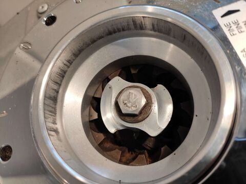Egész biztos, hogy a rezgő pumpa korlátos, az igazán nagy ugrás pedig egy roto lenne. A vízterítése nem rossz egyébként a GC-nek, de én a gyári alu mellett teszem le a voksomat. Kezdtem annak idején az aluval, rézzel, saját gyártású egyedi rézzel és megint az alu van a gépben. Véleményem szerint az alu a legjobb. Azon kívül, hogy egy hitvány szar valami van egy nagyon nagy előnye. A furatok kúposak rajta. Annál sokkal nagyobb kúpszöggel rendelkeznek mint ami a gyártáshoz kellene, hogy pl. könnyen lecsússzon egy szerszámról vagy ilyesmi. A táguló keresztmetszet miatt a folyadék áramlása lelassul. A réz hármas furatain sokkal nagyobb sebességgel áramlik a víz. Egyébként is féloldalas a fej kialakítása miatt. Ha szembe állsz a géppel akkor a bal oldalon lép ki a fejből a víz, azon az oldalon a vízterítőn lévő két furaton is nagyobb lesz az áramlás. Szűkítő és aeropress papír nélkül simán gödrösíti a pogi tetejét.