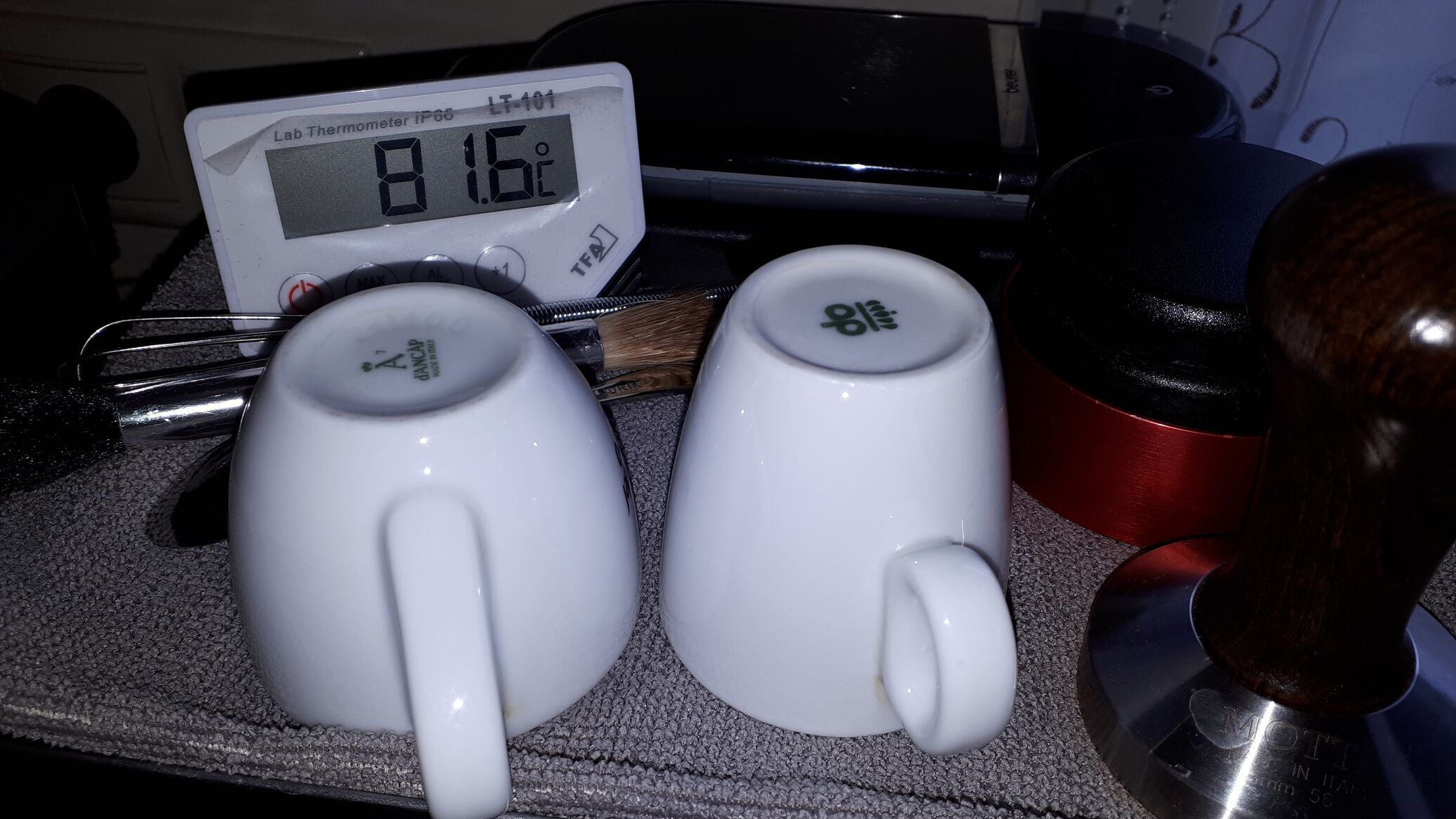 Csináltam még egy próbát, kivágtam egy hártyavékony fallal rendelkező műanyag poharat az aljától egy cm-re, egy meghajlított drótkerettel az 58-as felsőszűrőhöz passzentosan pont oda lehet tartani. A pohár oldalfalán levő likon dugtam most be a szondát. 2x90 mp-et csapoltam előáztatás módban, a kifolyó vizet direkben mèrve a pohárban. Az eredmény ugyanaz, csak 2 fokkal alacsonyabban, 87 fok körül mozog az a pár tized +/-. Ezt amúgy a másik géppel csináltam, nem a tegnapival, a pid ugyannúgy 90 fokon állt.