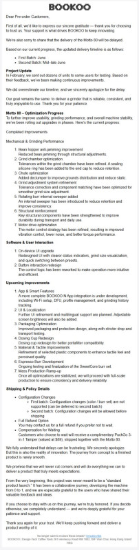 Csúszik, ahogy szoktak az ilyen első körös dolgok. Most épp újév van kínában, ez ott a legnagyobb ünnep, nem készültek el előtte így most áll a projekt. Viszont előtte készült egy kisebb batch, amit kiküldtek a kínai első körös vásárlóknak hogy az arra kapott visszajelzésekből bármi hiba már ne legyen a nyugati világnak küldendő első, és majd második körös termékekben. Az omni késen kicsit változtattak, a saját állításuk szerint ugyanolyan jó maradt filterre de jobb lett presszóra