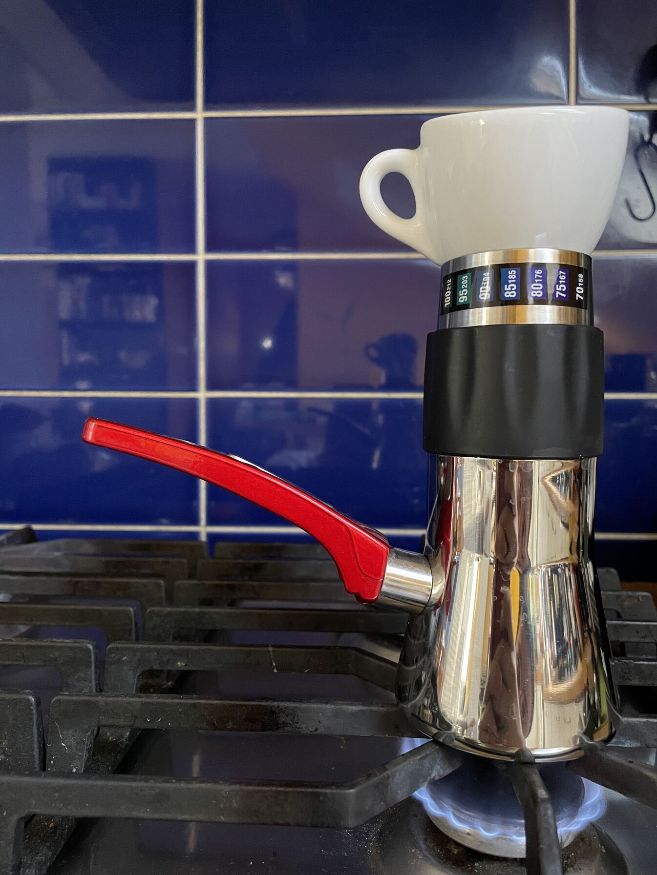 Más. Most hetek óta a SoundVision féle módszerrel melegítek elő, így még könnyebb lett a Flairrel való munka. Nem kell ott állnom, nézni az időt meg felöntögetni.. Felrakom így a tűzhelyre, amíg előkészítem a kosarat, ledarálom a kávét, kb. el is készül, felöntöm, húzom. Kicsit túl hőpozitív is így a dolog, várnom kell egy jó fél percet amíg visszahűl az ibrikben a víz, mielőtt beleöntöm a hengerbe.