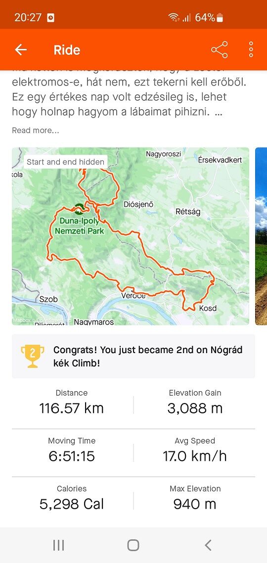 kicsit óvatosan mentünk, ismeretlen útvonal + itt-ott nedves is volt). ez ugye nem verseny volt, hanem teljesítménytúra, mi azért keresgéltük a határainkat, a szokásosnál kevesebb pihenővel toltuk le. 97 km, 1227 m szint, 3:46 menetidő, 4:18 eltelt idő, 25.7-es átlag lett a vége. azt ki merem jelenteni, hogy eddig ez volt az eddigi legkeményebb (és egyben legszebb) utam, de remélhetőleg ezt még idén felülírja egy balatonkör.ami nem tetszett: a frissítőkre azt mondták, hogy 40 és 70 km-nél lesznek, ehhez képest 48 és 78 körül voltak, az elsőnél már attól féltünk, hogy eltévedtünk, mert annyira nem jön sehol a pihenő, a másodiknál már számítottunk rá. szerencsére nem volt belőle baj, volt nálunk elég kaja-pia, csak sikerült beszaratni minket.