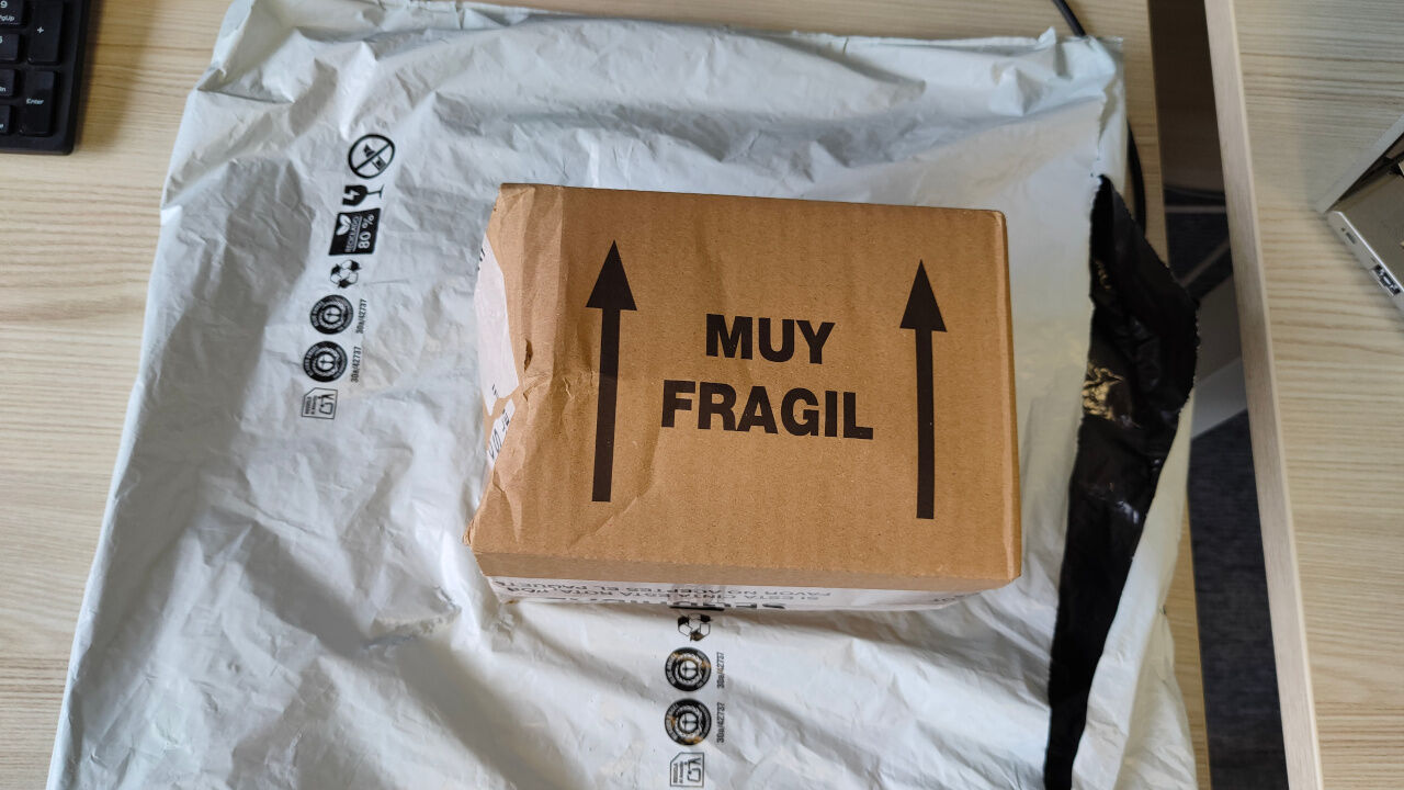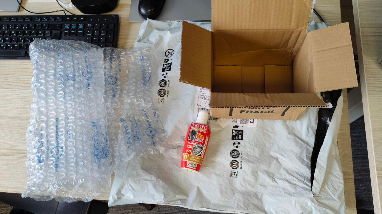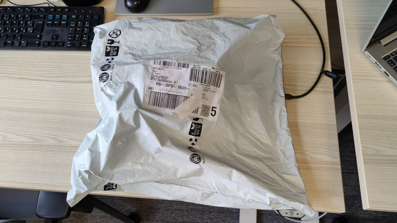 TradeInn sztenderd doboz. A garminomat is ilyenben küldték. Pont ugyanígy, egy meggyötört muyfragile mintás kartondoboz egy fehér zacskóban. Pont ekkora. Szerencsére belül ki volt pakolva bubis fóliákkal a garminos dobozok körül, amik megint kemények. Valszeg ebből a dobozból rendeltek húszezret, most mindennek ebbe kell beleférnie.