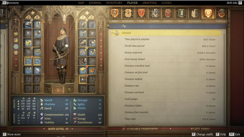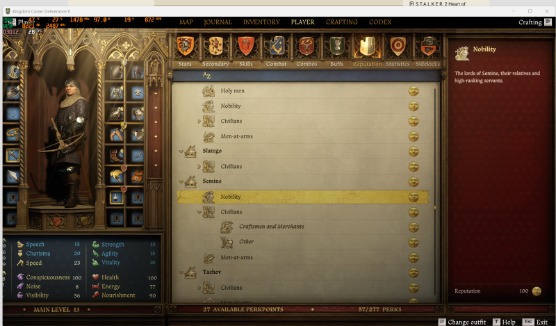 Lopakodós és full armor szettet össze tudtam rakni azaz plate armor paddingal és sötétebb ruhával. Amolyan medium armor amivel bőven tudok lopakodni. Majd 0-ás lesz a noise ha mindent meg tudok javíttani. Nyilván a chain cuccokat mellőznöm kellett de így is bőven jól véd és le tudok állni kardpárbajra közepes banditákkal is könnyedén. A cél majd full plate lesz, könnyű sisakkal sötét színben 0 noise és 20 vagy alatti visual stattal. Szóval nem lesz szükségem külön egy full heavy armor szettre, amúgy is roleplay miatt nem akarok ilyen heavy tankot.