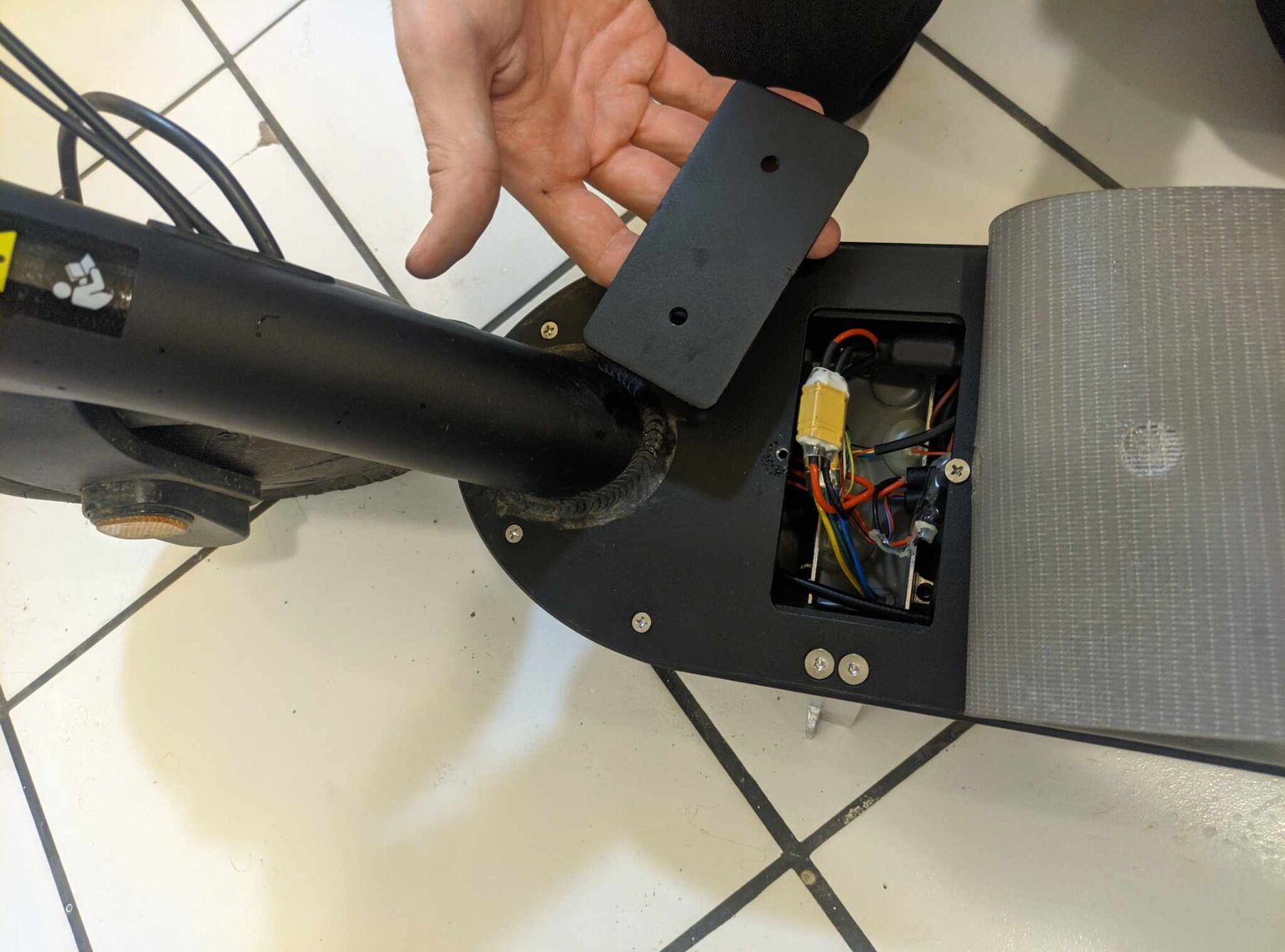 Vásároltam egy Okai Neon Lite ES10 rollert. Egyrészt egyébként jelenleg ajánlom a kütyüt, mert tök jó, hozza az alap rollerrel szemben támasztott elvárásokat, másrészt pedig szeretnék megosztani pár infót a belsejéről, amolyan dokumentáció jelleggel, hátha valakinek kell még majd (új FW írás, vagy hasonlók).Szétszedni úgy kell, hogy a taposólemez elején a gumiszőnyeget le kell húzni. (Ragasztott, de utána visszaragad.) Ott van egy téglalap alakú fém, amit ha kicsavarozol, akkor alatta lesz a motorvezérlő, plusz pár kábel.