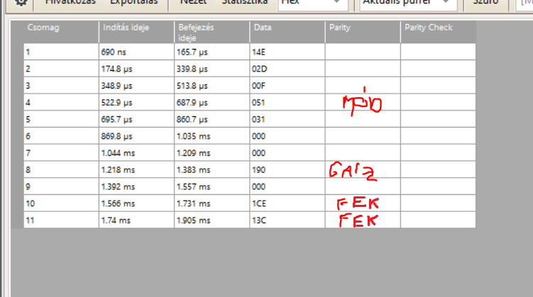 És van egy UART RX - TX páros. Ezeket az alábbi paraméterekkel sikerült dekódolni: