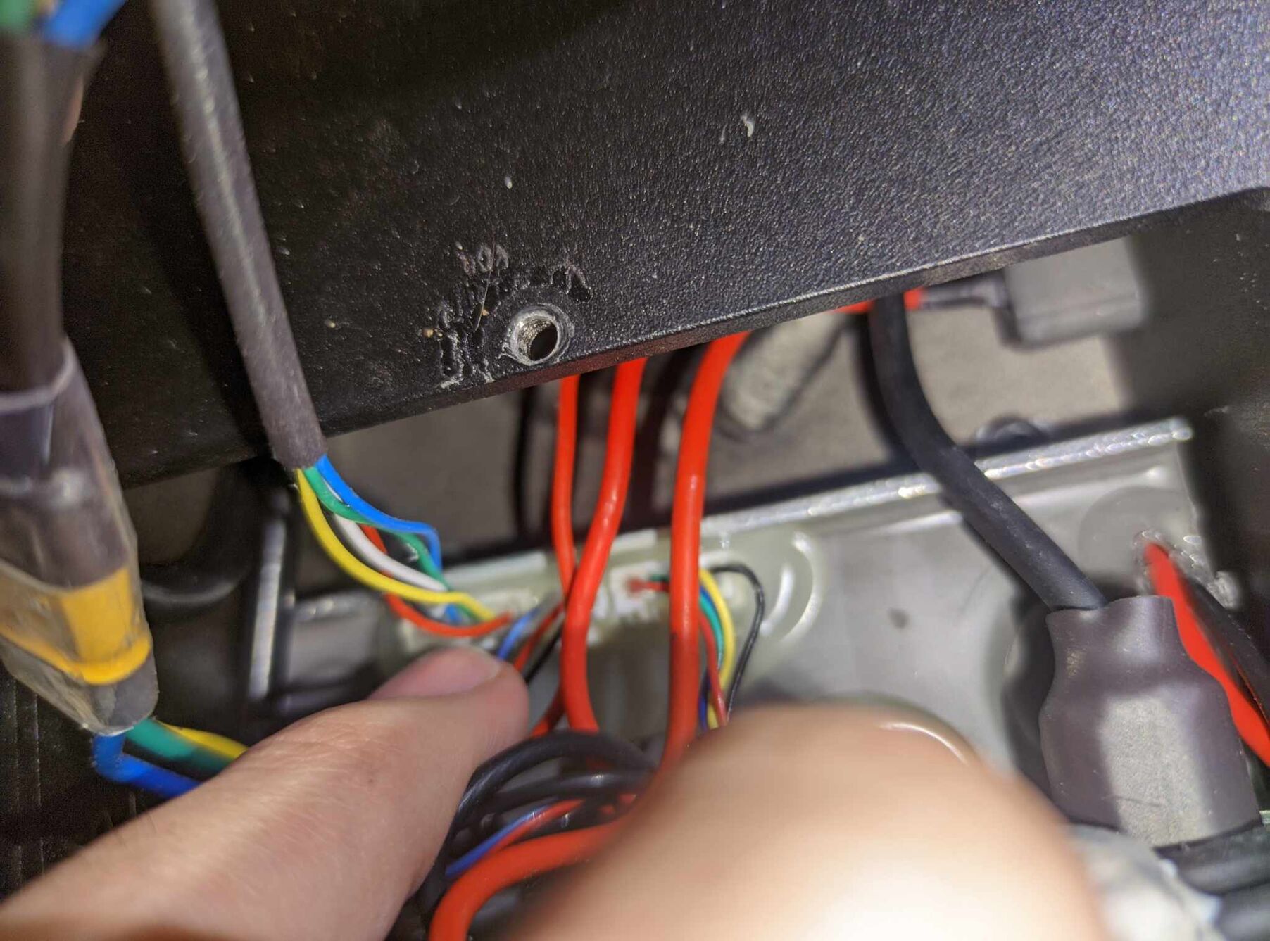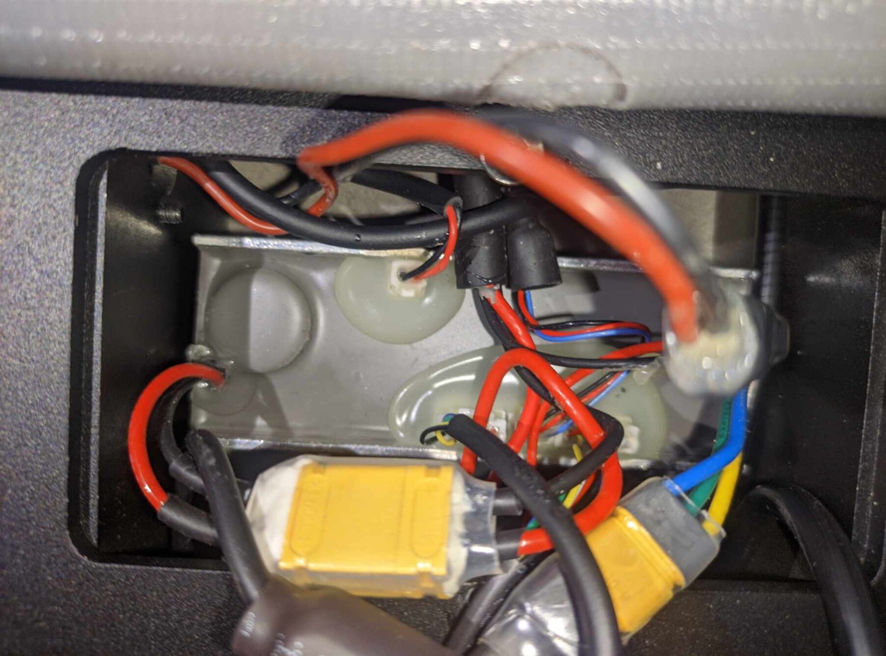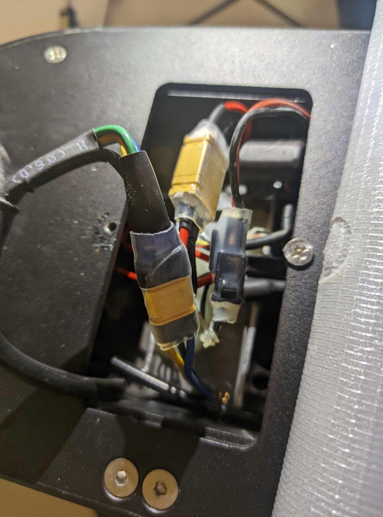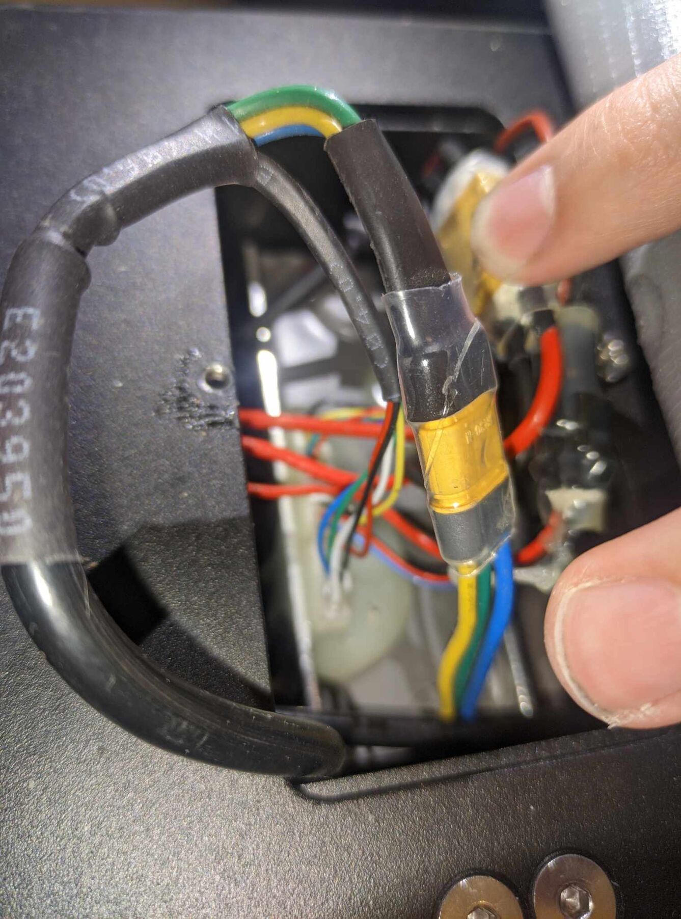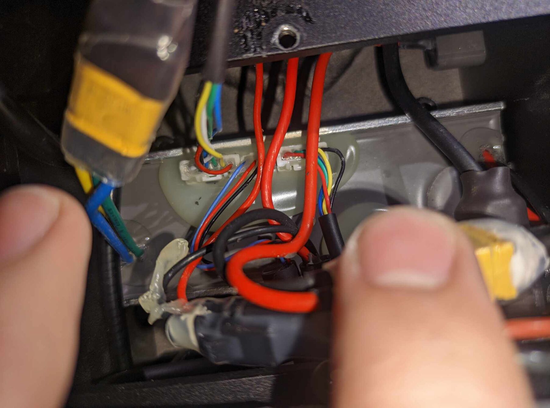 Amire sikerült rájönni az az, hogy az egyik az akku lesz (XT90 azt hiszem, fekete-piros), a másik a töltőcsati (ez is fekete-piros de sokkal vékonyabb), a harmadik a BLDC motorba megy (3 ér, sárga, zöld, kék), illetve van a körben egy - valószínűleg - biztosíték. Megtaláltuk még a motorból jövő hall-szenzorok vezetékeit is.A kormányoszlopban pedig 2 kábel van, ezek is ebből a kis dobozkából közlekednek felfelé. Az egyik csak átmegy ezen az egész részen, a vezérlőhöz köze sincs, a másik viszont a vezérlőből jön, és a kormány tetején lévő kijelzőbe megy bele. Mindkét kábelt meg lehet csapolni a kormányoszlop szétszedésével (ez teljesen garanciakompatibilis, mert szétszedve érkezik a roller). Az egyik 3 eres, a másik 5 eres. Az 5 eres jön a vezérlőből. A csatlakozók típusa a kormányoszlopban "Mini J Signal Connector for scooter", 3 és 5 pines.