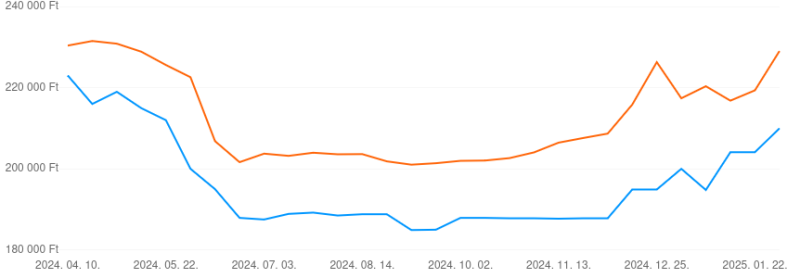 2024. áprilisban 225-ről indult, lement 190 környékére, most 210k.
