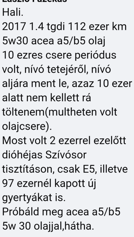 Nekem amikor egy benzines ami alapból nem eszi gondos gazdája van 10.000kmes olajcsere, időben megdióhéjaztatta... és e mellett is már 100.000kmnél megvan a 10.000km/1liter az gáz. Főleg mert elég gyorsan tud eszkalálódni. Direkt nem olyan hszt hoztam aki "időben" 15.000kmenként cserélt ott sokkal rosszabb a helyzet. -