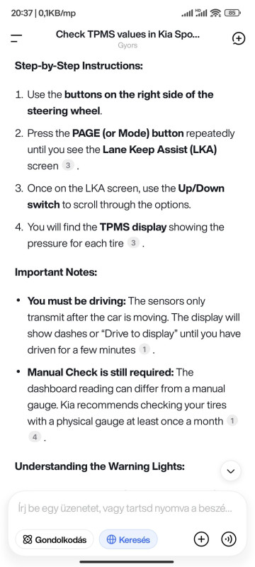 Szomszédomnak van egy 2021-es Sportage, amiben szeretné megnézni a TPMS értékeit. Hol, hogyan tudja előcsalni? -